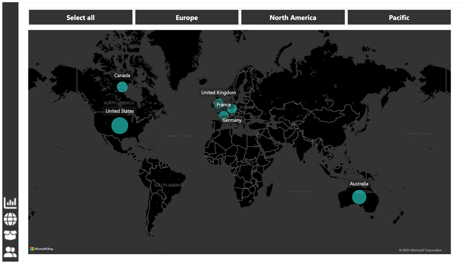 Map: The second report page consisted of a map visual, an interactive representation of sales volume across different geographical locations. This offered insight into Adventure Works’ global sales distribution and worldwide reach.