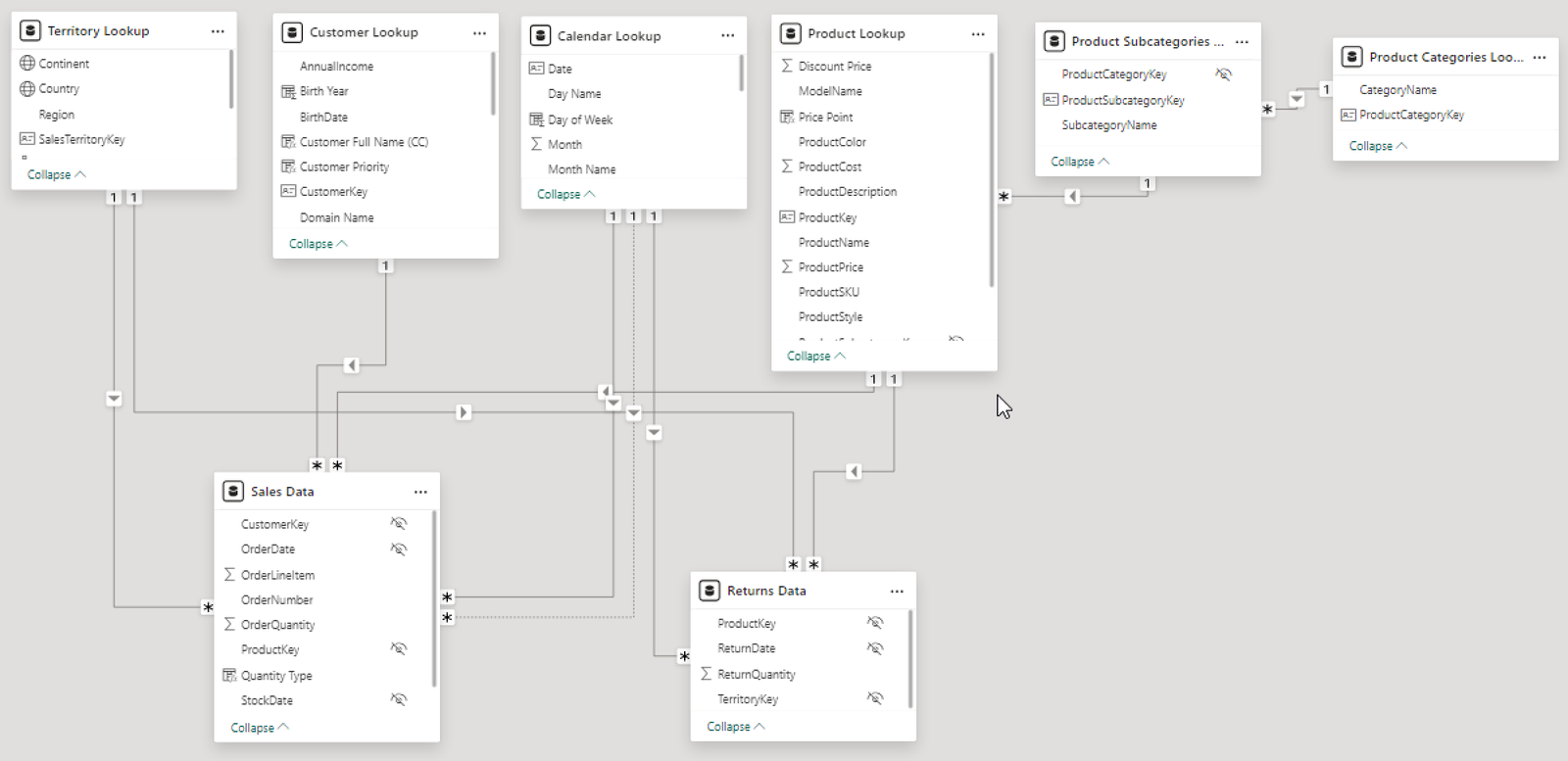 Enabling active or inactive relationships, creating hierarchies for fields such as Geography (Continent-Country-Region) and Date (Start of Year-Start of Month-Start of Week-Date), and finally hiding the foreign keys from report view to ease the data analysis and visualization steps and reduce errors.